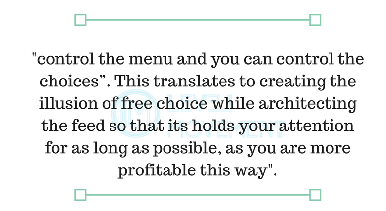 So the feeds we see are individually tailored to our preferences. A well known psychological trick is: "control the menu and you can control the choices”. This translates to creating the illusion of free choice while architecting the feed so that its holds your attention for as long as possible. As you are more profitable this way.
