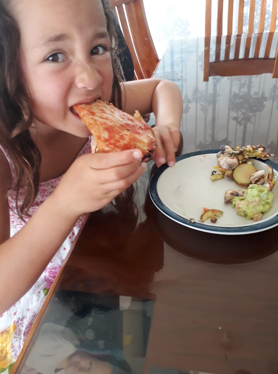 When making your healthy home made pizza, you want to make vegetables as your biggest component. We are an omnivore family, so we had bits of meat in ours. Go easy on the cheesy too. Our kids had more cheese as their nutritional requirements are different to ours.